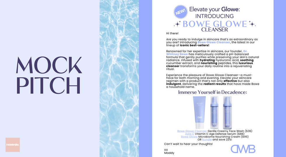 The Dr. Whitney Bowe Beauty PR Launch Strategy was a recent project that focused on the launch of a new facial cleanser. The project was completed during an internship at Tractenberg & Co, and involved creating a PR launch strategy that targeted specific editors and influencers to promote the product. Overall, the project aimed to achieve 3 three goals: create authentic, memorable experiences with the brand, forge loyal, strong relationships with influencers & media, and diversify the target audience by expanding to Gen Z.